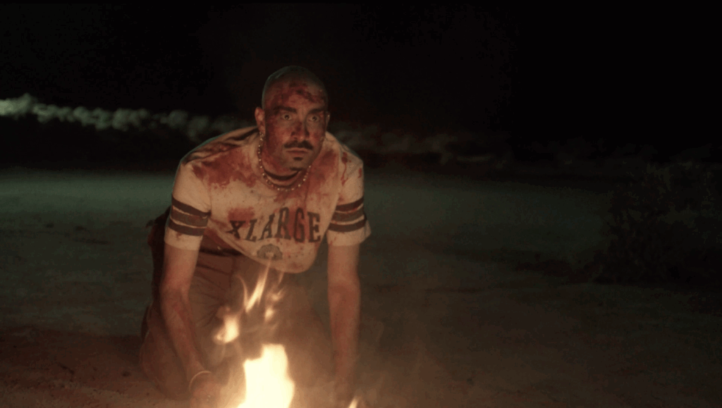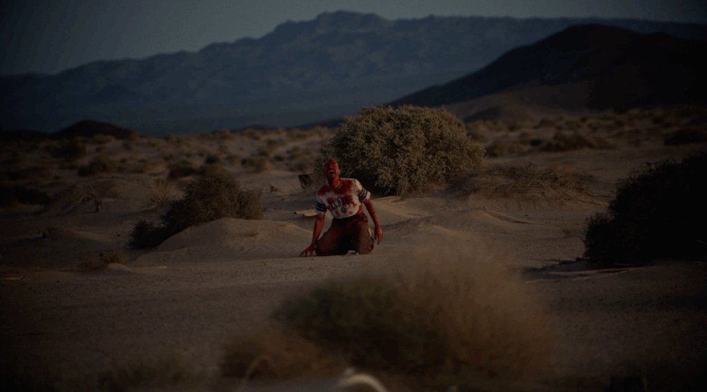 Josh covered in blood… but why? Screenshot from “In The Valley: A Cosmic Queer Abduction Film.”